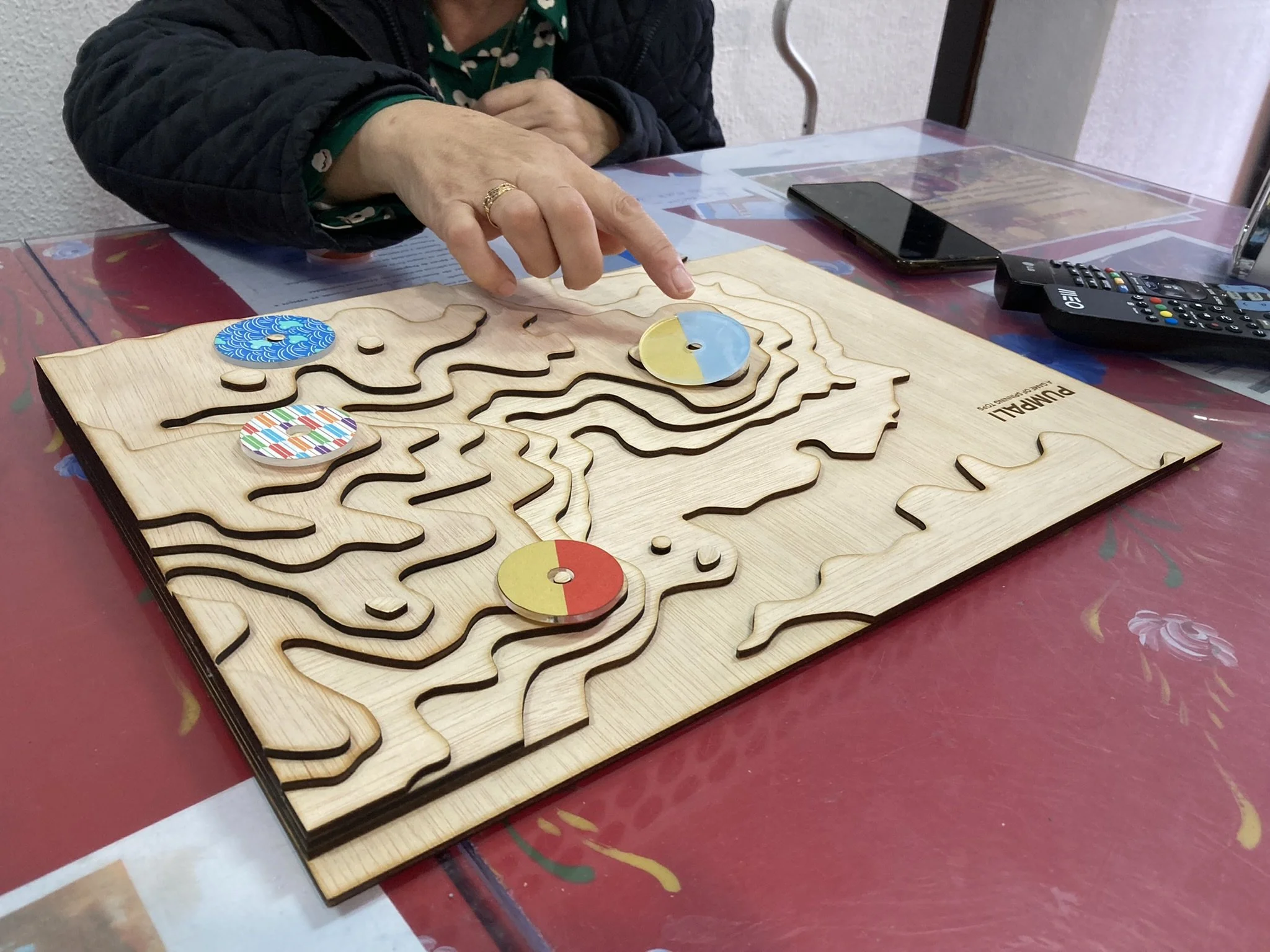 A game board laser cut from plywood based on local topography, acrylic circles, colored paper, and wooden pegs. Developed in the frames of an art residency at Buinho Creative Hub in the village of Messejana, Portugal. The open-ended elements of the game were offered for testing without prior instruction in an activity with older adults. Free to manipulate the objects, they were asked to come up with ideas on how the game could be played and assign different meanings and possible functions to the elements.